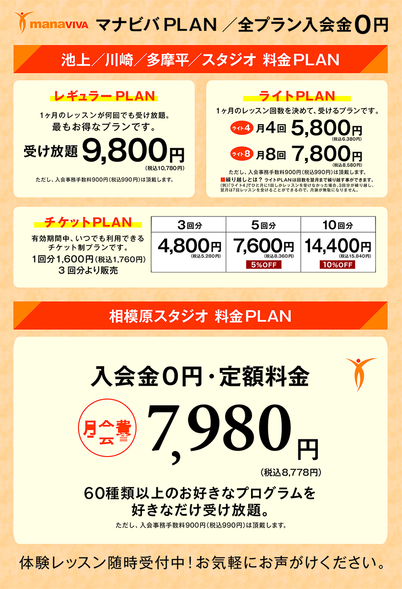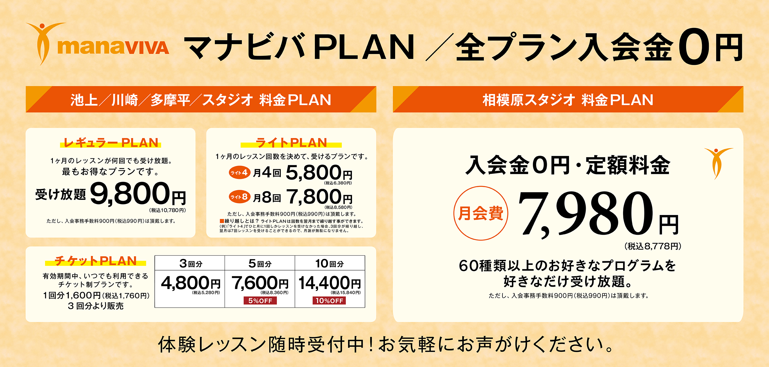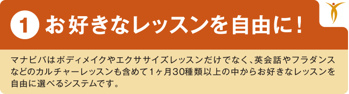 ミドル・シニアの人生をもっと豊かにポジティブに過ごして頂きたい。 ココロが元気になればアクティブになる。 アクティブになればカラダも元気になる。 カラダが元気になれば、もっとポジティブになり意欲的に! この循環を意識したプログラムを提供するのが「マナビバ」居心地がよく毎日通える。 けれども多様な講座で何時でも刺激を感じられる。 ポジティブなシニアライフを感じていただく為の健康スタジオです。マナビバでは、固定のレッスンに通うのではなく、 カルチャースクールのようなアタマレッスンと フィットネスジムのようなカラダレッスン、 いろいろご用意しています。 空いてる時間にお好きなレッスンを好きなだけ受けられる システムです。初心者の方にも安心して参加いただけます。